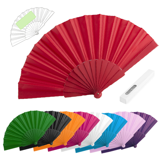 Abanico con varillas fabricadas en resistente plástico y tela en poliéster. Varillas y tela a juego, disponible en variada gama de colores. Presentado en caja individual blanca con ventana.