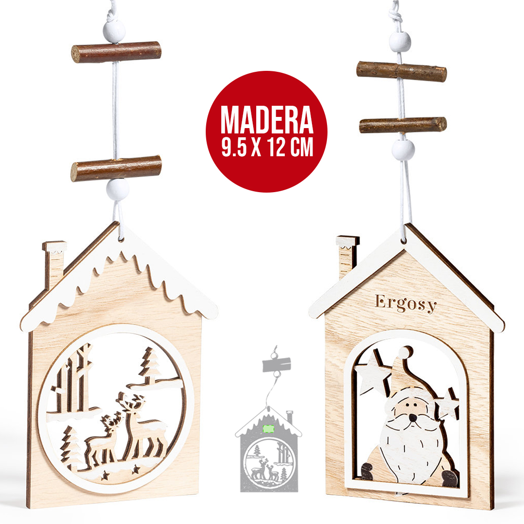 Elegante y moderno adorno navideño en madera natural. Incluye accesorio para colgar y está disponibles en dos diseños: Papa Noel y motivos navideños.