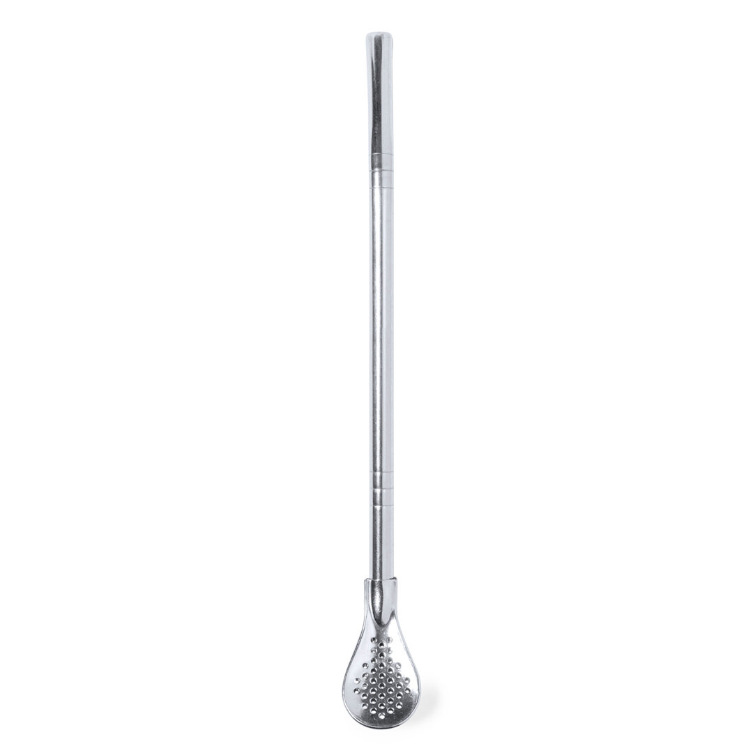 Práctico agitador con pajita en acero inox. Con diseño elegante y funcional, este accesorio es esencial para bebidas frías o calientes. Pajita integrada que permite absorber con facilidad y en el extremo inferior una práctica cucharilla con filtro. Presentado en una bolsa individual.