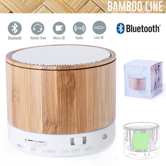 Compacto altavoz con cuerpo en bambú y conexión Bluetooth®. Rejilla metálica, con 3W de potencia, función manos libres, una ranura para tarjetas mini SD, función radio FM, y base antideslizante. Recargable mediante cable USB -incluido- y presentado en una atractiva caja de diseño. Conexión Bluetooth. Potencia Sonido 3W. Batería 300 mAh