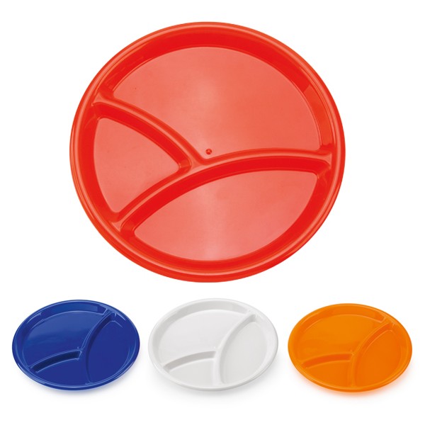 Bandeja de entremeses en resistente PP de variados colores. Con 3 compartimentos.