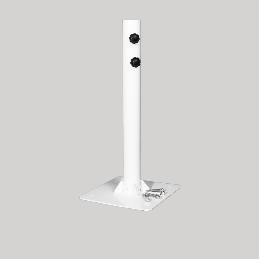 Base de Acero pintado blanco. Contiene orificios y 4 pernos para anclaje. Para quitasol P14 o quitasoles con asta de Ø60mm.