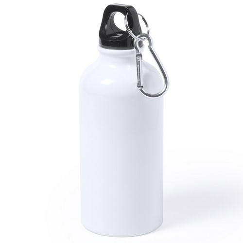 Bidón de 400ml de capacidad con cuerpo de acabado en suave y brillante color blanco, especialmente diseñado para marcaje en sublimación. Con tapón de seguridad a rosca y mosquetón metálico de transporte. Presentado en caja individual. 400 ml