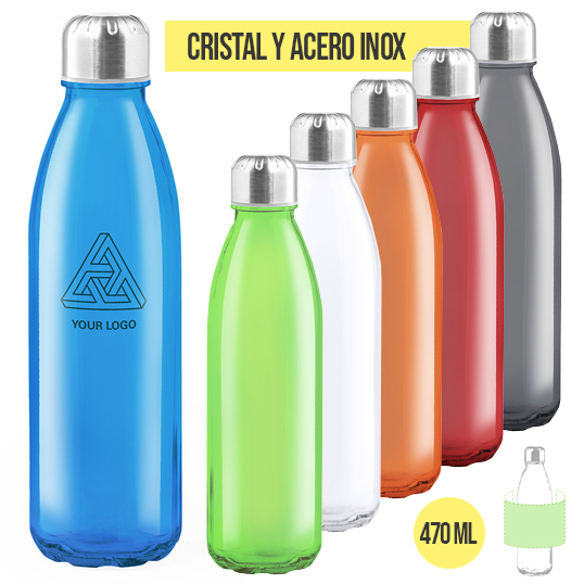 Bidón de 650ml de capacidad. Fabricado con cuerpo de cristal, disponible en variada gama de colores, y tapón a rosca de acero inox y acabado cromado. Presentado en caja individual de atractivo diseño. 650 ml