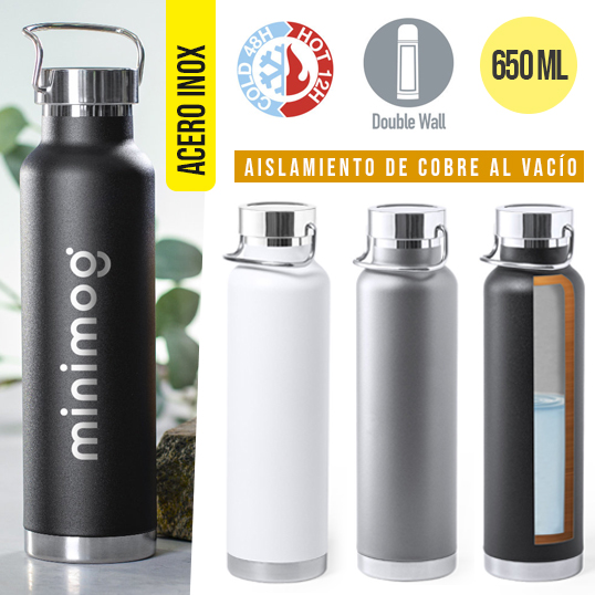Bidón térmico de acero inox, con doble capa y aislamiento de cobre al vacío. El mismo le permite mantener el calor y el frio durante un tiempo más prolongado, llegando a las 12 y 48 horas respectivamente. De 650ml de capacidad, y disponible en variada gama de colores metalizados. Presentado en atractiva caja de diseño. 650 ml. Aislamiento de Cobre al Vacío