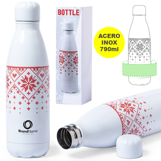 Bidón de 790ml de capacidad con cuerpo de acero inox brillo y diseño bicolor de navidad. Con tapón de seguridad y presentado en atractiva caja de diseño. 790 ml