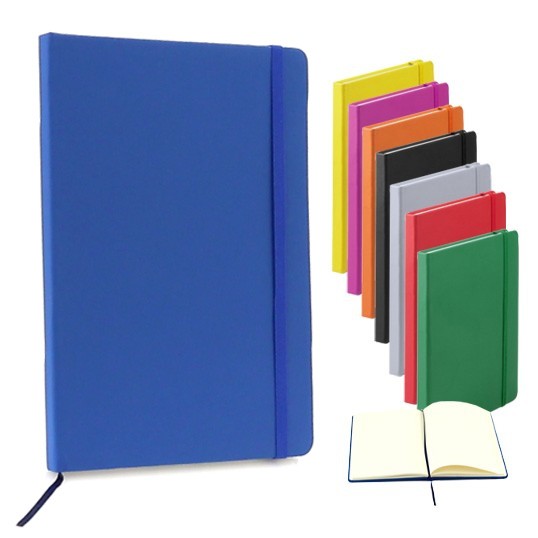 Bloc de notas con tapas de suave tacto, acabado en polipiel y en desenfadados colores. De 100 hojas lisas, con elástico de sujeción y marcapáginas de tela a juego. Portada Rígida. 100 Hojas