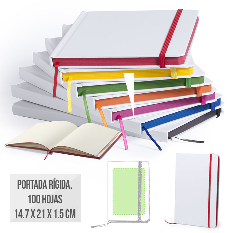 Bloc de notas con tapas rígidas de suave tacto acabadas en color blanco. De 100 hojas lisas con lomo en divertidos colores, elástico de sujeción y marcapáginas de tela a juego. Portada Rígida. 100 Hojas