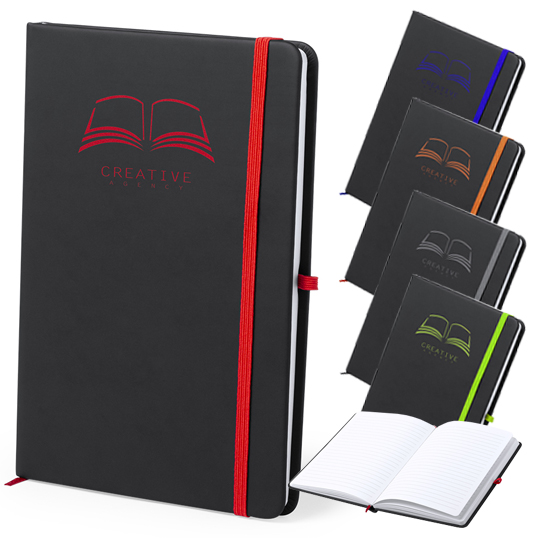 Bloc de notas con tapas de suave tacto acabadas en polipiel. En elegante color negro, con elástico de cierre, marcapáginas y soporte elástico para bolígrafo en vivos colores. Recubrimiento exterior especialmente diseñado para marcaje en láser, con el que conseguirá que su publicidad o marca quede perfectamente grabada en color a juego con el del artículo. Incluye 100 hojas con disposición a una raya. Portada Rígida. 100 Hojas