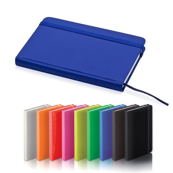 Bloc de notas con tapas de suave tacto, acabado en polipiel y en desenfadados colores. De 100 hojas lisas, con elástico de sujeción y marcapáginas de tela a juego. Portada Rígida. 100 Hojas