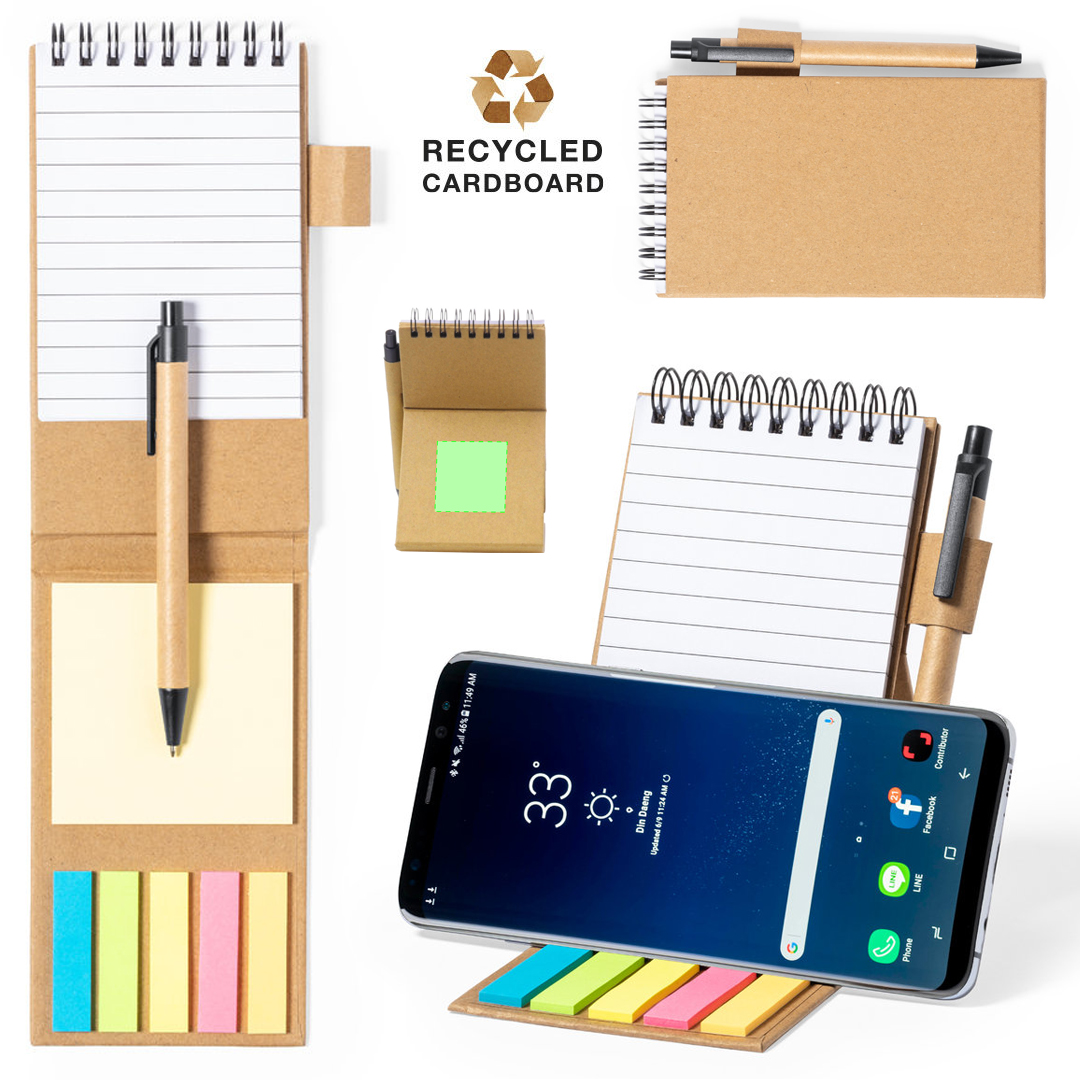 Bloc de notas de línea nature convertible en soporte para smartphone y fabricado en cartón reciclado. Incluye: Bloc de anillas de 30 hojas blancas, con disposición a una raya y soporte para bolígrafo. Bolígrafo en cartón reciclado con detalles en negro, de mecanismo pulsador y en tinta azul.25 notas adhesivas medianas.125 mininotas adhesivas en varios colores. Bloc 30 Hojas. 25 Notas Adhesivas 7,5 x 7,5 cm. 125 Mininotas Adhesivas 1,2 x 5 cm. Bolígrafo Cartón Reciclado Incluido