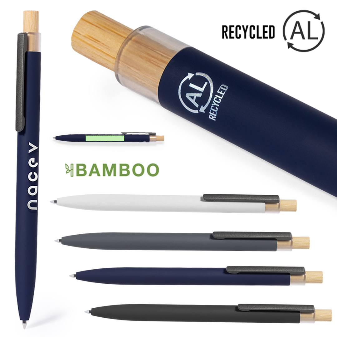 Bolígrafo de mecanismo pulsador fabricado en aluminio reciclado. Pulsador en bambú y cuerpo acabado goma, disponible en variada gama de elegantes colores. Clip metálico y distintivo aluminio reciclado en la parte superior del bolígrafo. De cartucho jumbo y en tinta azul. Presentado en bolsa individual reciclada.El aluminio reciclado es un material con posibilidades de reciclaje casi infinitas, sin perder sus propiedades originales y consumiendo menos energía en este proceso.Certificación GRS (Global Recycled Standard / Estándar de Reciclaje Global), que garantiza el origen reciclado del material usado para fabricar el producto. Carga Jumbo