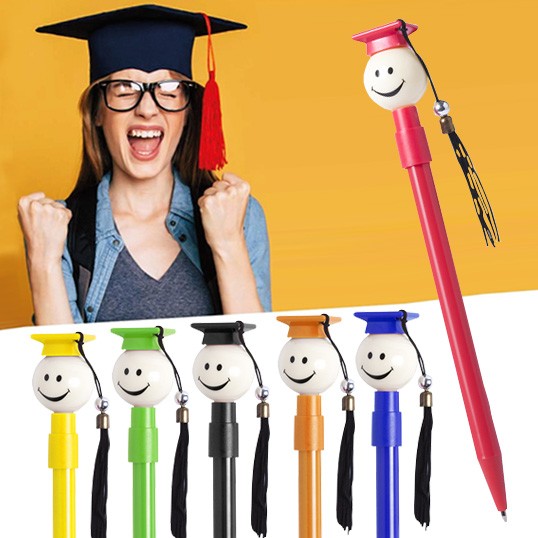 Divertido bolígrafo para los graduados en variada gama de vivos colores. Con pom pom de tela y tinta azul.