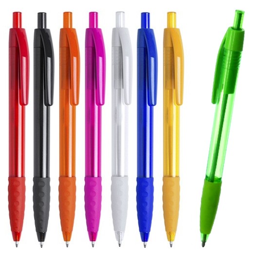 Bolígrafo con mecanismo de pulsador, con cuerpo en color tránslucido en alegres colores. De suave y cómoda empuñadura y con clip a juego. Tinta azul.