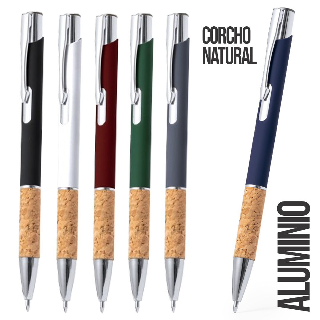 Elegante bolígrafo de línea nature y mecanismo pulsador. Cuerpo en resistente aluminio de acabado goma y empuñadura en corcho, con la caña en una amplia gama de distintivos colores. Clip metálico, con pulsador retráctil y en tinta azul. Presentado en bolsa individual reciclada.Elaborado con elementos vegetales para así fomentar la utilización de materias primas naturales y reducir las emisiones contaminantes.