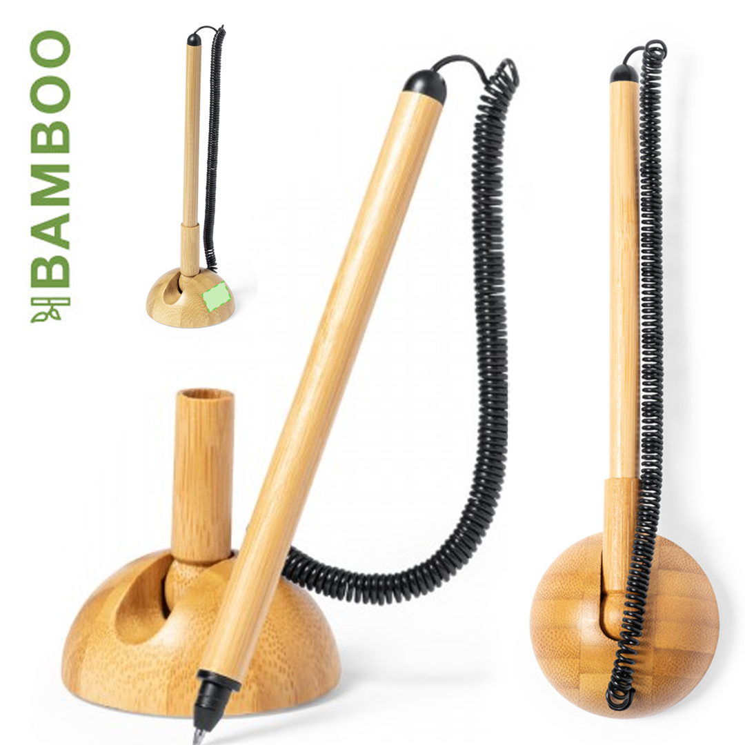 Bolígrafo de línea nature fabricado en bambú, en tinta azul y con cable extensible. Incluye soporte de bambú para el bolígrafo, con adhesivo 3M en la base, fijación extra fuerte y libre de residuos al despegarlo. Presentado en caja individual de diseño kraft. Base Adhesiva
