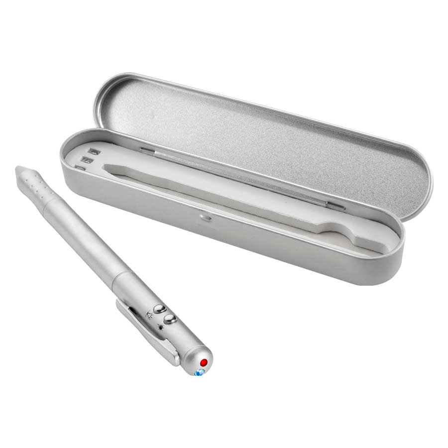 Bolígrafo metálico multi-función 4 en 1. Incluye bolígrafo, linterna LED, puntero láser y puntero PDA (Palm). Presentación en estuche de aluminio. Escritura Azul.