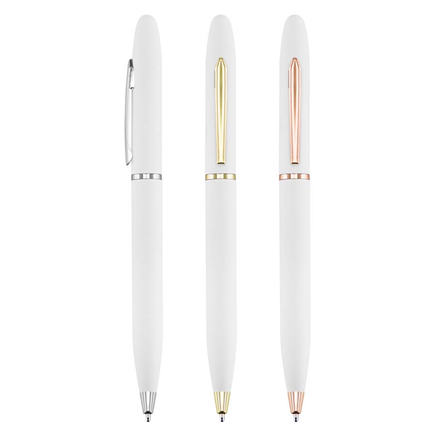 Fino bolígrafo Metálico blanco modelo "Trooper", con terminales metálicos. Diseño simple y moderno. Escritura negro.