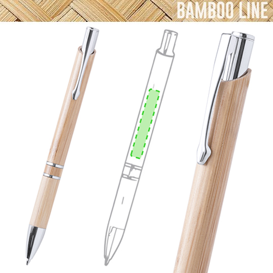 Bolígrafo de línea nature con cuerpo en madera de bambú. De mecanismo pulsador, con clip troquelado y detalles en acabado cromado. De cartucho jumbo y tinta negra. Carga Jumbo. Tinta Negra