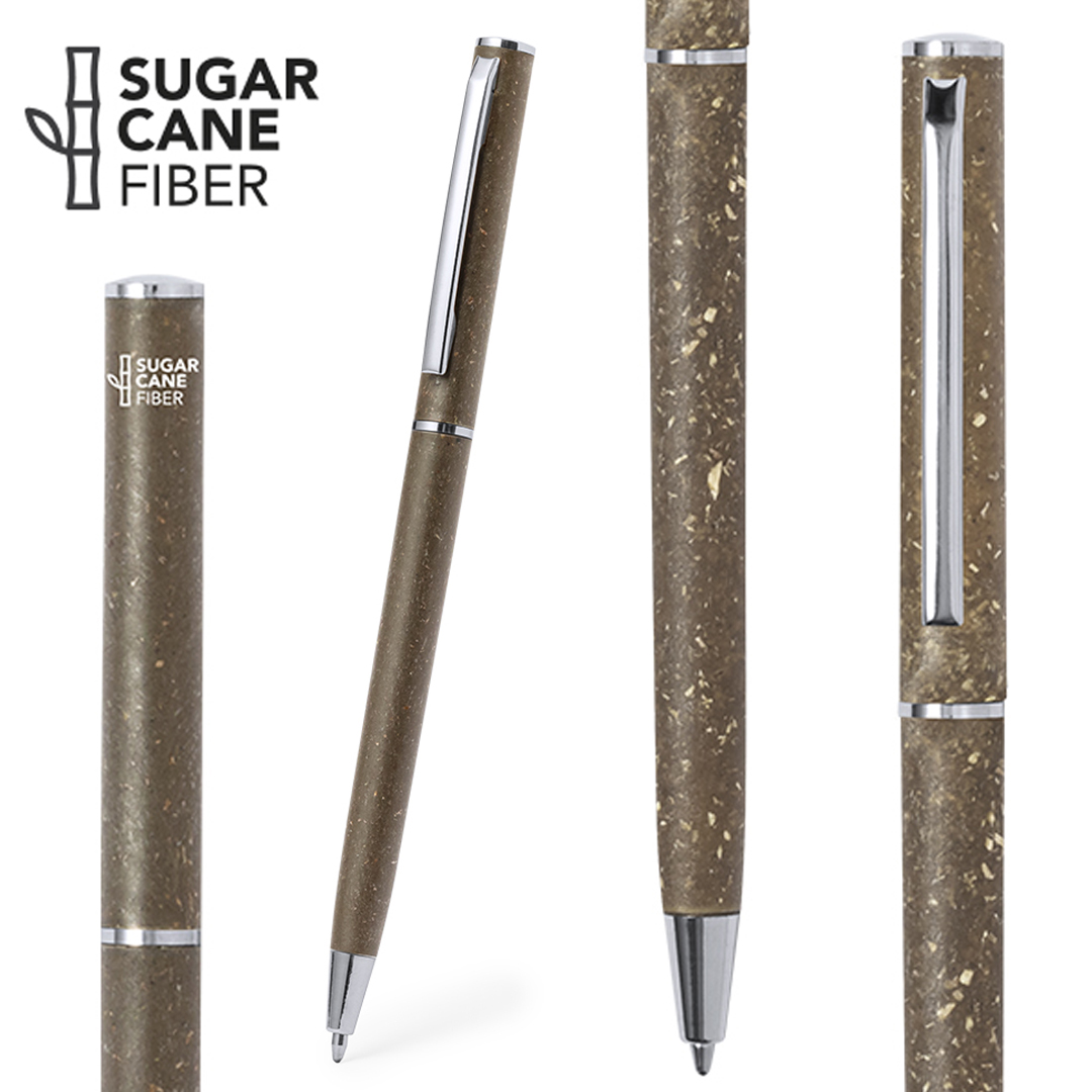 Bolígrafo con cuerpo en caña de azúcar. Clip metálico y accesorios cromados. De mecanismo giratorio y de tinta azul. Con logotipo caña de azúcar y disponible en color natural. La fibra caña de azúcar es un material natural con origen en materiales biodegradables que proceden del residuo vegetal fibroso resultante tras la extracción del jugo de la caña de azúcar. Se trata de un material resistente, con estilo sostenible y respetuoso con el medio ambiente.