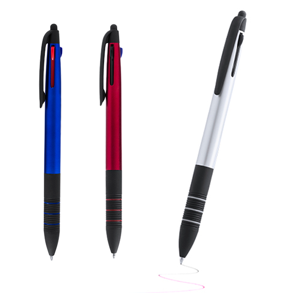 Bolígrafo puntero 3 en 1 de mecanismo pulsador retráctil, de actual diseño y cuerpo de suave acabado metalizado en vivos colores. Con accesorios en negro y suave empuñadura ergonómica en color negro con anillas a juego. De 3 cartuchos en tintas azul, roja y negra. Escritura 3 Colores