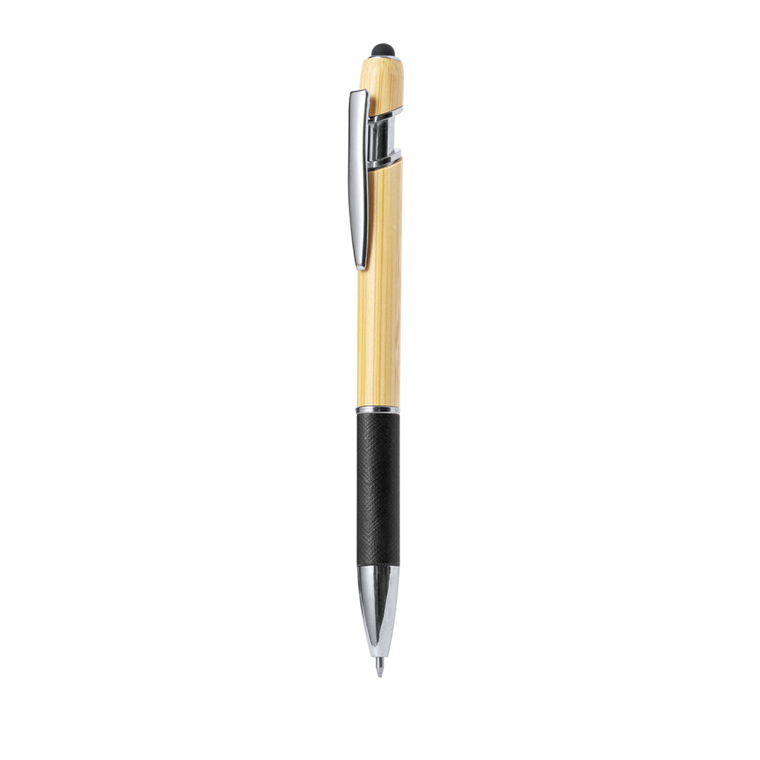 Bolígrafo puntero con cuerpo en bambú y papel reciclado. Caña fabricada en suave bambú con empuñadura hecha en cartón reciclado con textura y en variados colores. En la parte superior tiene un puntero negro. Clip metálico y accesorios en cromado. De mecanismo pulsador y en tinta azul. Elaborado con elementos vegetales para así fomentar la utilización de materias primas naturales y reducir las emisiones contaminantes.