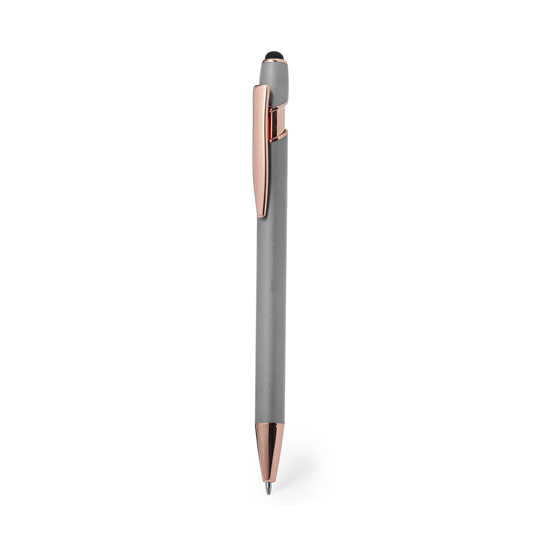 Excelente bolígrafo puntero de aluminio con mecanismo pulsador. Cuerpo en resistente aluminio de acabado mate con elementos decorativos de elegante acabado color cobre, con la caña en una amplia gama de distintivos colores. Clip metálico, con pulsador retráctil y puntero negro en la parte superior. En tinta azul. Presentado en una bolsa individual reciclada.