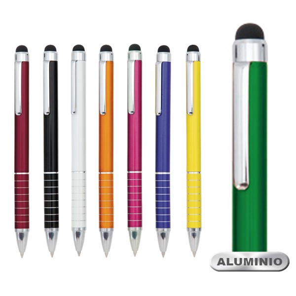 Bolígrafo puntero de mecanismo giratorio con cuerpo en aluminio de suave acabado metalizado en vivos colores. Accesorios y anillas en color plateado. Original empuñadura anillada y tinta azul.