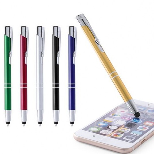 Bolígrafo puntero de mecanismo pulsador en divertidos colores. Acabado en aluminio brillante, de cartucho jumbo y tinta azul. Carga Jumbo