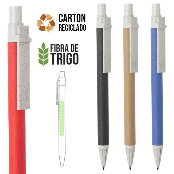 Bolígrafo con mecanismo pulsador de línea nature. Cuerpo en cartón reciclado, con accesorios en caña de trigo, para así fomentar la utilización de materias primas naturales y reducir las emisiones contaminantes. Disponible en variada gama de colores y en tinta azul.