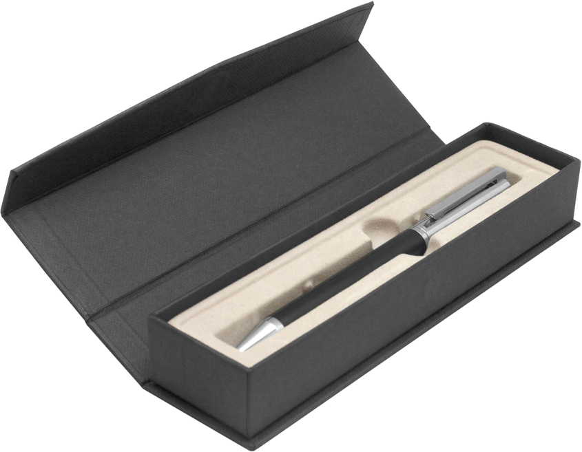 Metálico. Bolígrafo con apertura giratoria. Destape acero en la parte superior e inferior. Cuerpo color negro. Clip, tambor superior y puntera color plata. Tinta azul. Presentación en estuche con cierre magnético.