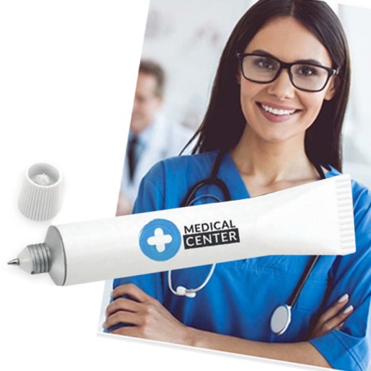 Original bolígrafo con diseño de tubo y cuerpo sólido en color blanco. Con capucha a rosca y de tinta azul.