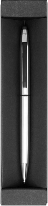 Metálico. Cuerpo color plata. Clip color negro mate, apertura giratoria con puntera touch. Cartucho metálico. Tinta negra. Estuche de cartón. Decape cobrizo claro. Presentación en caja de regalo.