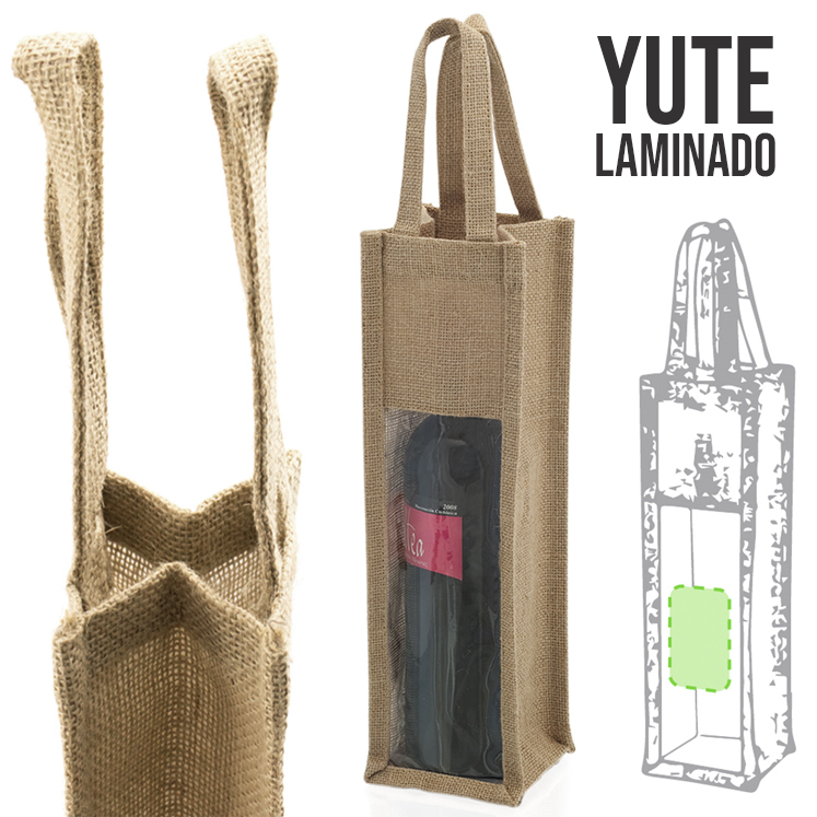 Resistente bolsa de yute laminado para botella de vino de 75cl. Con ventana transparente, ribetes y asas reforzadas.