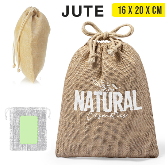 Bolsa de línea nature en resistente yute de 260gsm, con elegante cierre de cordón y acabado cosido.
