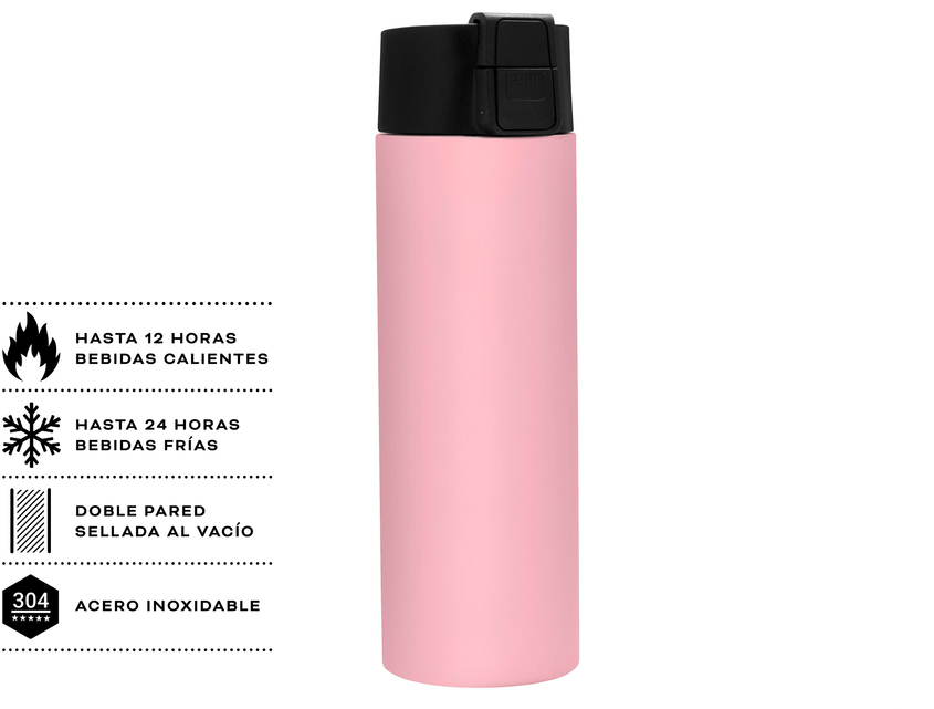 Ø 7 cm x 23 cm. Acero inoxidable. Capacidad 450 ml. Botella doble pared, sellada al vacío. Interior de acero 304 y exterior de acero 201. Pintura acabado mate. Tapa en PP con traba de seguridad y botón pulsador de apertura. Mantiene por más de 12 hs la temperatura de las bebidas calientes y 24 hs de las bebidas frías. Presentación en caja de regalo kraft.
