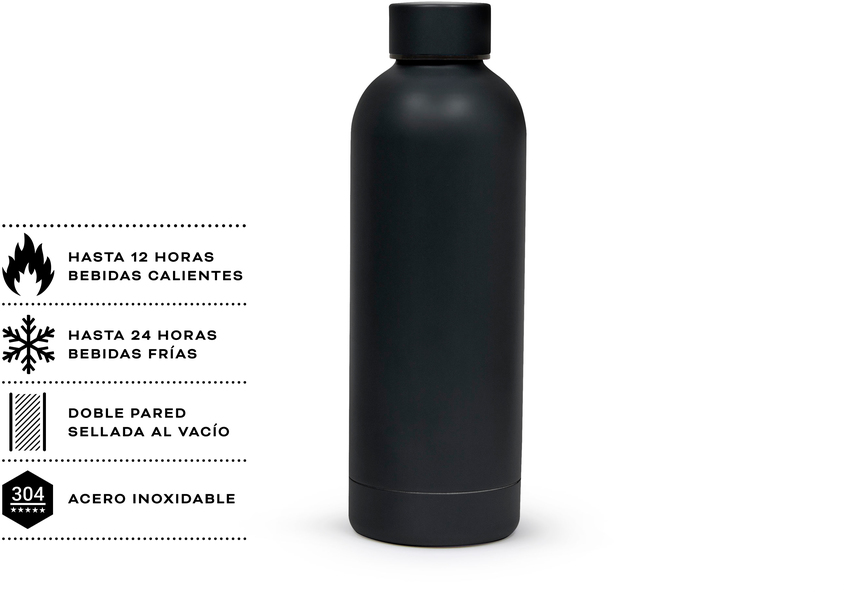 Ø 7.4 x 22 cm. Capacidad 500 ml. Acero inoxidable. Botella doble pared, sellada al vacío. Interior en acero 304 y exterior en acero 201. Mantiene hasta 12 hs la temperatura de las bebidas calientes y 24 hs de las bebidas frías. Presentación en caja de regalo.