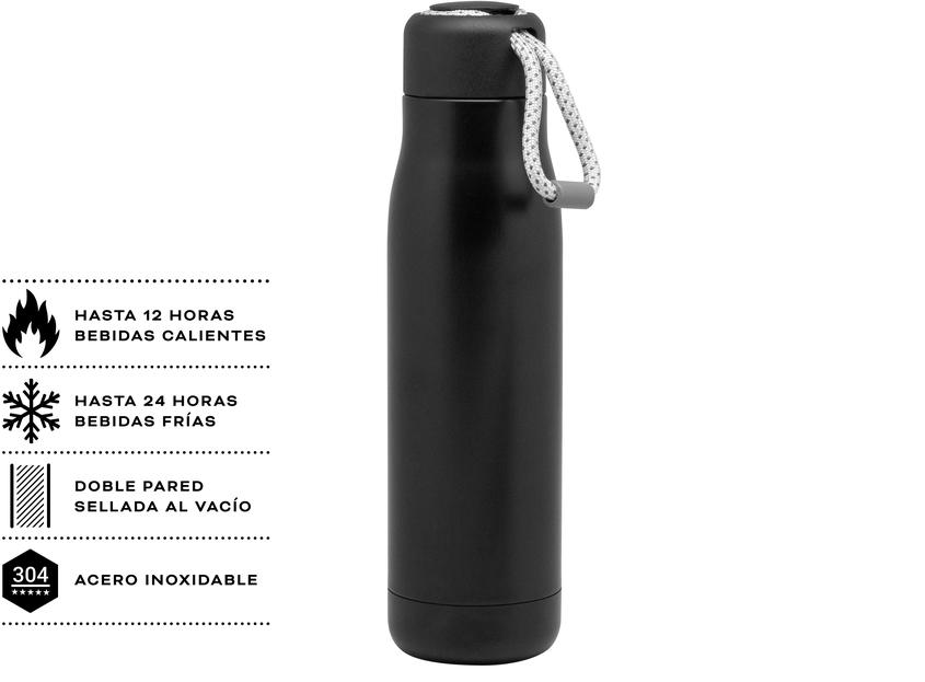 Botella doble pared, sellada al vacío. Interior de acero 304 y exterior de acero 201. Tapa plástica PP y anillo de silicona. Posee además tira de color gris de 12 cm de largo. Ideal para llevarla a todos lados. Mantiene hasta 12 hs la temperatura de las bebidas calientes y 24 hs de las bebidas frías.