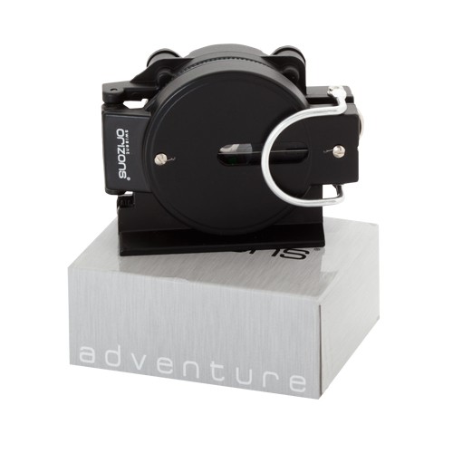 Brújula de Orizons de alta precisión con cuerpo en resistente aluminio, accesorio de fijación y presentada en atractiva caja de diseño con logotipo de la marca.