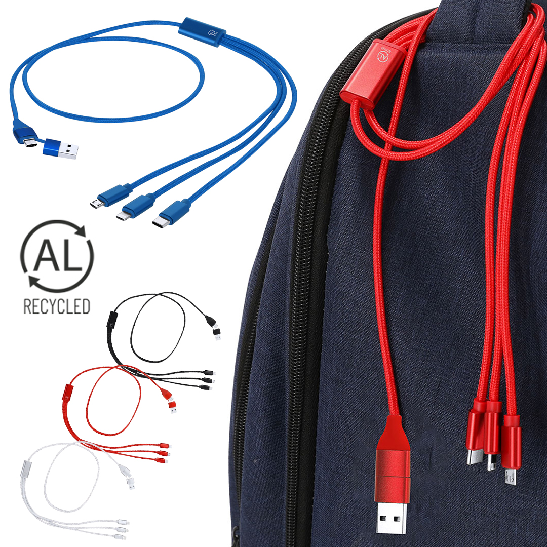 Cable cargador en Aluminio Reciclado. Con conexión de entrada dual Tipo C/USB y salidas Tipo C, Lightning y Micro USB. Incluye distintivo Aluminio Reciclado.El Aluminio Reciclado es un material con posibilidades de reciclaje casi infinitas, sin perder sus propiedades originales y consumiendo menos energía en este proceso.Certificación GRS (Global Recycled Standard / Estándar de Reciclaje Global), que garantiza el origen reciclado del material usado para fabricar el producto.Conexión Micro USB, Tipo C y Lightning 5V DC 2.4A Conexión Micro USB, Tipo C y Lightning 5V DC 2.4A