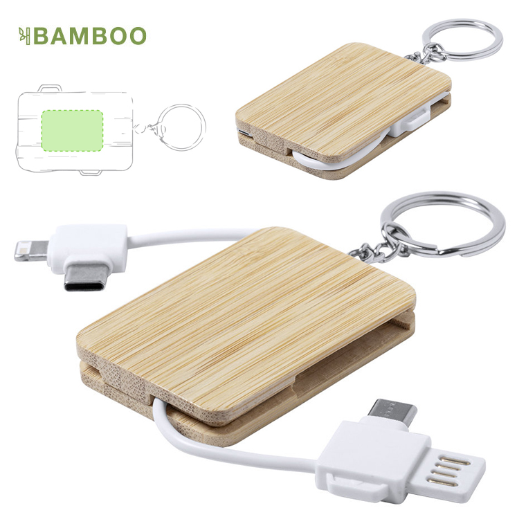 Cargador llavero de línea nature y diseño compacto. Hecho en bambú procedente de cortes naturales. Conexiones Tipo C (entrada y salida) y dual micro USB-Lightning, con sistema USB reversible que facilita la conexión a la fuente de alimentación. Amplia superficie de marcaje. Presentado en bolsa individual autocierre de diseño eco. Conexión Micro USB, Tipo C y Lightning 5V DC 2.0A