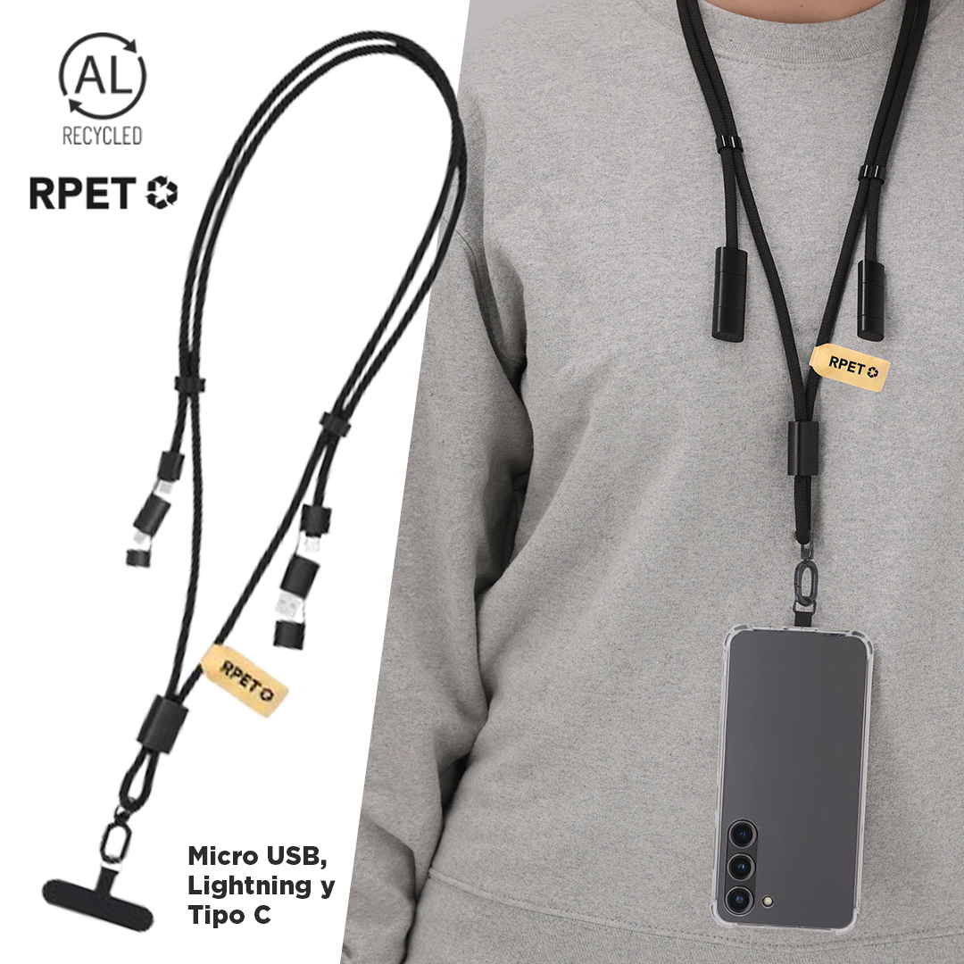 Innovador lanyard con función de soporte y cable cargador, fabricado en una combinación de poliéster RPET y aluminio reciclado. Diseñado para colocarse fácilmente entre la funda y el smartphone gracias a su accesorio de transporte. Incluye cinta a juego, mosquetón metálico giratorio en color negro y accesorio de seguridad para el cuello. Ofrece funcionalidad de carga y traspaso de datos, con entrada USB y Tipo C, y salidas Micro USB, Lightning y Tipo C. Presenta un distintivo de RPET en etiqueta kraft, destacando su compromiso sostenible.El material RPET se elabora a partir de plástico reciclado, para así fomentar la reutilización de residuos plásticos y ayudar a la sostenibilidad del planeta.El Aluminio Reciclado es un material con posibilidades de reciclaje casi infinitas, sin perder sus propiedades originales y consumiendo menos energía en este proceso.Certificación GRS (Global Recycled Standard / Estándar de Reciclaje Global), que garantiza el origen reciclado del material usado para fabricar el producto. Conexión Micro USB, Tipo C y Lightning 5V DC 2.4A