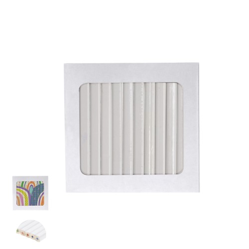 Cajas de12 lápices de madera acabado blanco, con cuerpo hexagonal y minas en varios colores. Presentados en estuche de cartón con cierre de solapa. Diseñado especialmente para grabado digital.