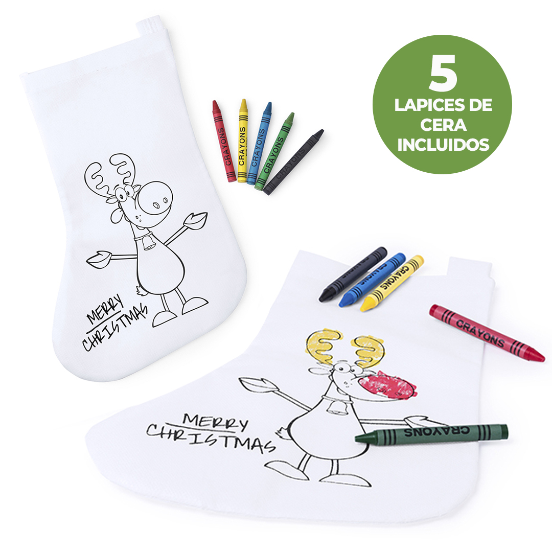 Calcetín de non-woven en color blanco especialmente diseñado para colorear con ceras. Incluye 5 ceras de cuerpo cilíndrico en variados colores. Con cinta para colgar y de acabado termosellado. 5 Ceras Incluidas