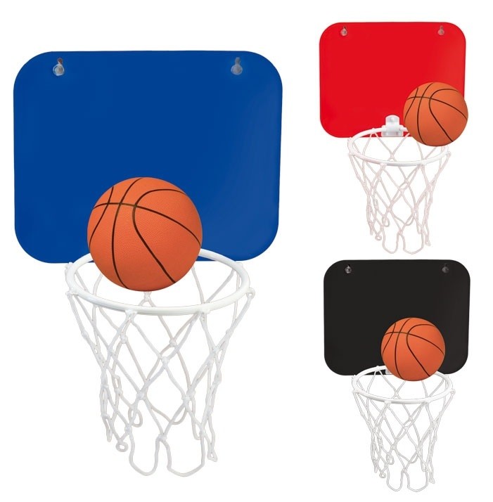 Canasta en PVC con tablero en vivos colores. Con pelota de minibasket incluida y ventosas en parte trasera para fijación. Bola Incluida