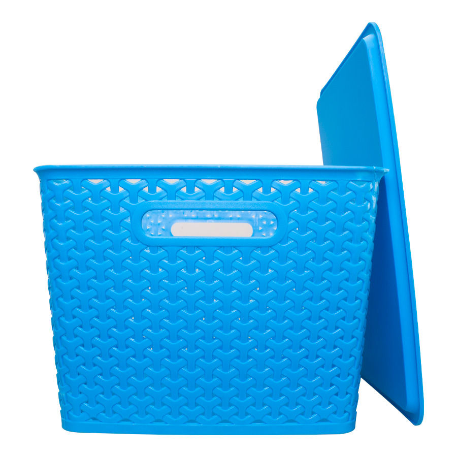 Canasto plástico organizador de 36.5 x 30 x 22 cm con tapa plástica. Diseño entrelazado tipo ratán. Capacidad 24 lt.