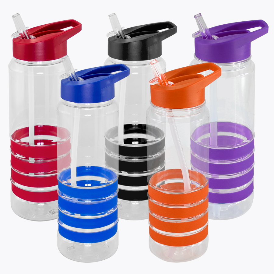 Botella deportiva modelo "Tritan", de plástico rígido traslúcido Tritan con 4 anillos de silicona de color. Tapa de plástico PP de color con bebedero retráctil. Incuye bombilla plástica en el interior. Para líquidos fríos (no térmico).
