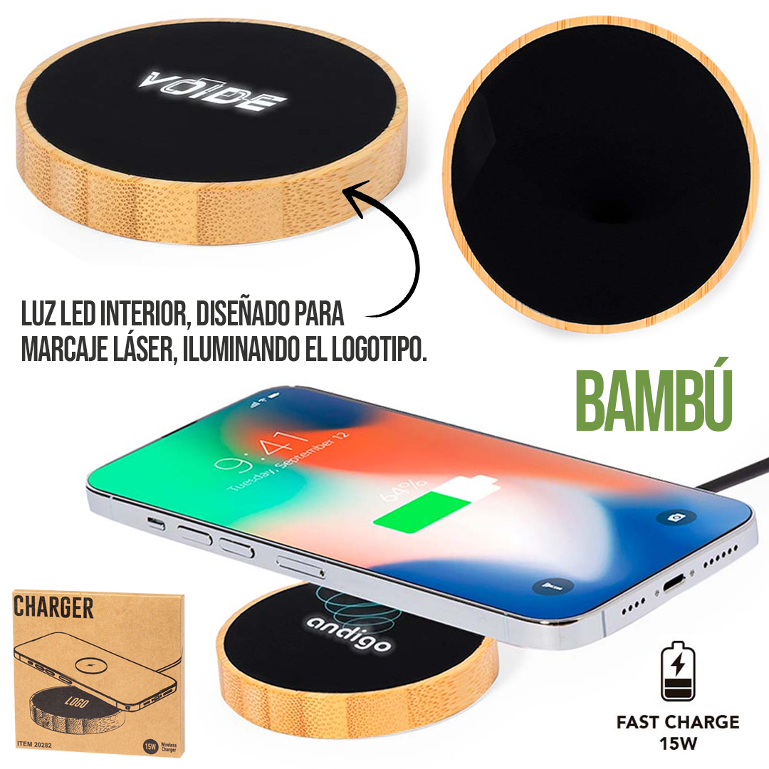 Cargador inalámbrico circular. Fabricado en bambú, con superficie en elegante color negro. Luz led interior y recubrimiento exterior especialmente diseñado para marcaje en láser, iluminando así el logotipo. Con función carga de 15W, compatible con dispositivos equipados con tecnología de carga inalámbrica Qi. Con base antideslizante, incluye cable cargador Tipo C y manual de instrucciones en español e inglés. Presentado en caja individual de diseño kraft. Luces Led. Inalámbrico 15W