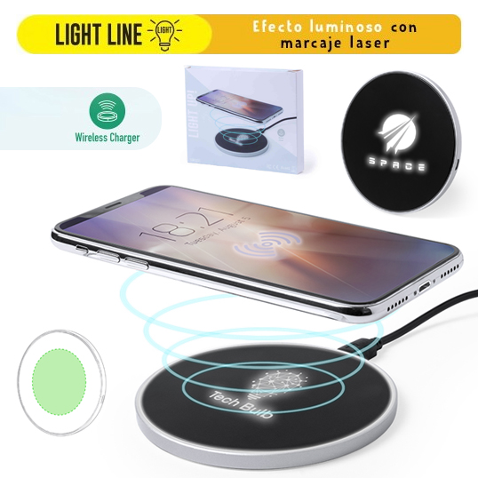 Cargador inalámbrico circular. En elegante color negro, con luz led interior y un recubrimiento exterior especialmente diseñado para marcaje en láser, con el que conseguirá que su publicidad o marca quede iluminada con luz blanca. Base antideslizante y compatible con dispositivos equipados con tecnología de carga inalámbrica. Presentado en atractiva caja de diseño. Cable USB incluido. Luces Led. Inalámbrico 10W