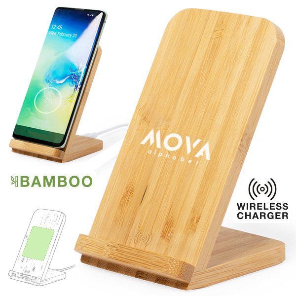 Cargador inalámbrico de línea nature con función soporte para smartphone. Hecho en bambú procedente de cortes naturales. Indicador de estado de carga y compatible con dispositivos equipados con tecnología de carga inalámbrica. Amplia superficie de marcaje y presentado en atractiva caja de diseño eco. Inalámbrico 10W